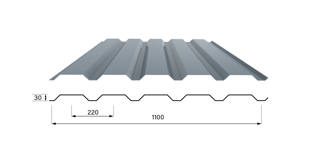 Traditionelles trapezförmiges Fassadenprofil mit einer Profilhöhe von 30 Millimetern, einer Arbeitsbreite von 1100 Millimetern und einer Profilbreite von 220 Millimetern mit 5 Profilen über der Arbeitsbreite. Damit ist DELFT 30/1000 gröber profiliert als DELFT 19/1090.