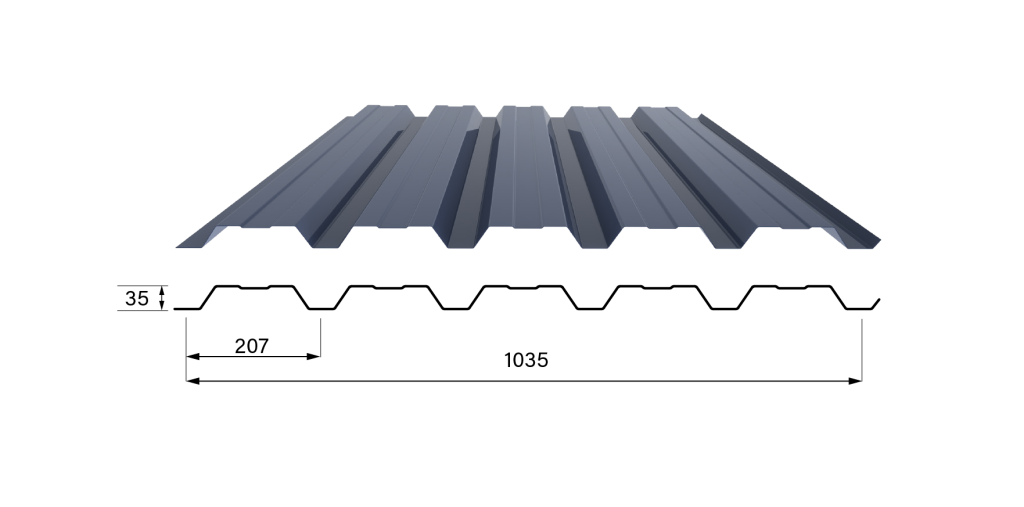 Fassadenprofil mit einer trapezförmigen Profilhöhe von 35 Millimetern, einer Arbeitsbreite von 1035 Millimetern und einer Profilbreite von 207 Millimetern mit 5 Profilen über der Arbeitsbreite. Die zusätzliche Vertiefung in der Profilierung sorgt für eine höhere Steifigkeit und einen eleganteren Look.