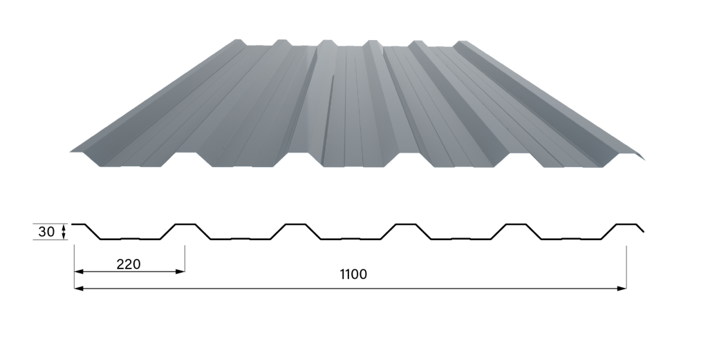 Uninsulated roof and external wall profile with a profile height of 30mm, an effective width of 1100mm and a profile width of 220mm with 5 profiles across the effective width. With an extra dimple in the profiling for greater rigidity and a more refined look.