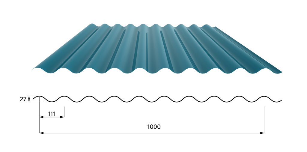 An external wall profile with a profile height of 27mm and an effective width of 1000mm. Sinusoidal profiles are very popular with architects and are widely used in the Netherlands.