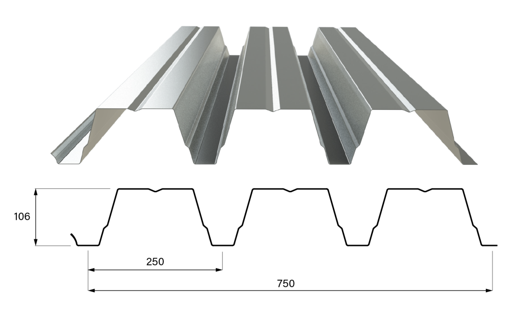 The high profile is used as a supporting profile for insulation and a waterproof roof covering. Thus, the roof is protected from the elements. The 106R/750 is an efficient and durable solution for various construction projects.